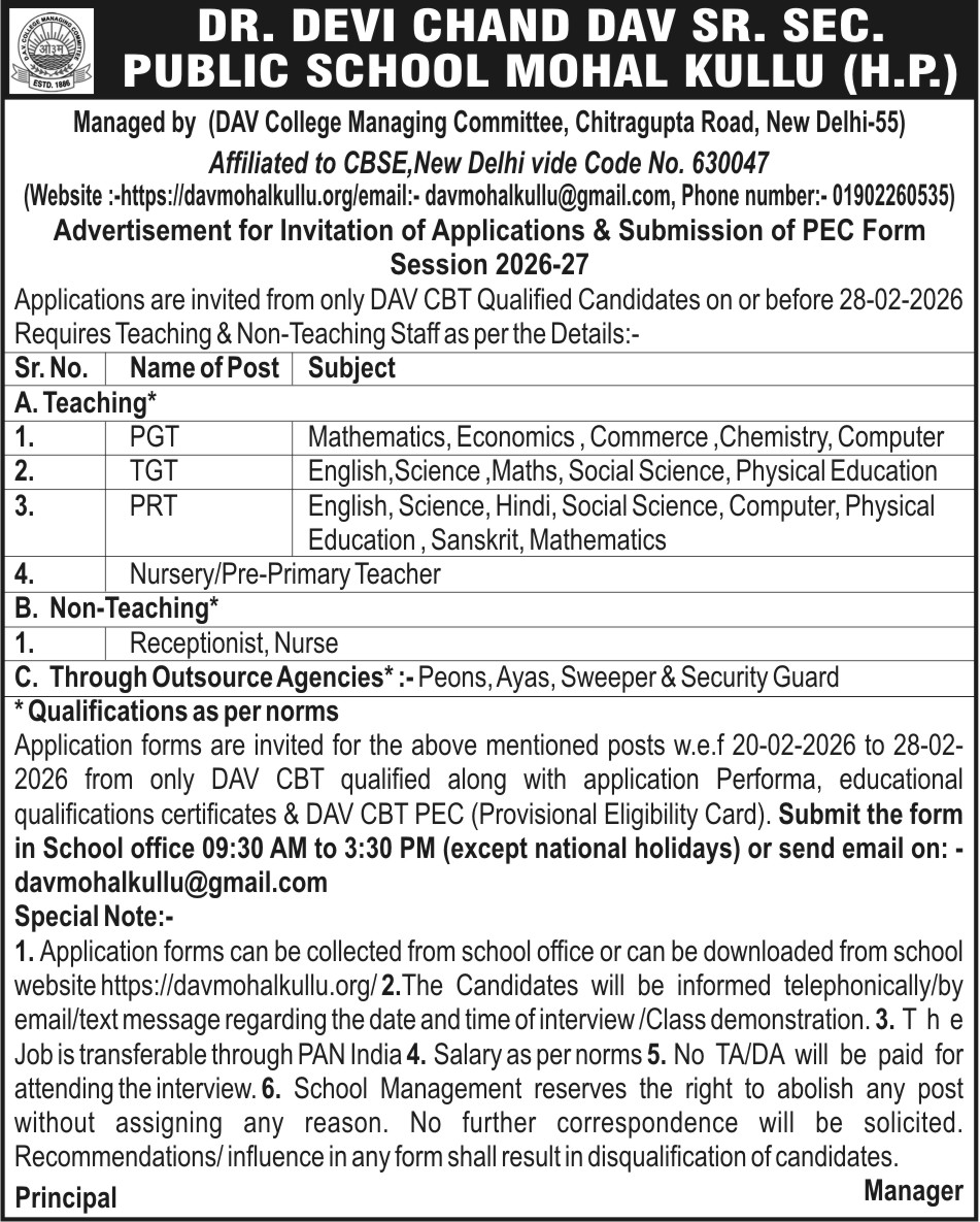 DAV Public School, Mohal invites applications from eligible and dedicated candidates for various Teaching and Non teaching positions.